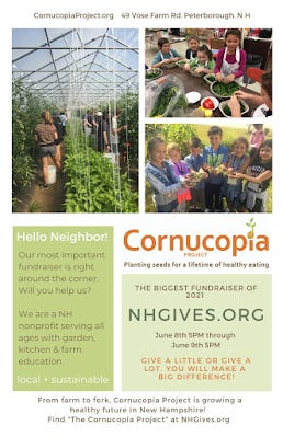 School gardening with Cornucopia Project is in full swing! In addition to coordinating this and other programs, I'm educating in the garden again and it is a blast! Please keep Cornucopia Project in mind for NH Gives, June 8-9: